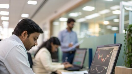 Defocused Indian workspace featuring professionals with abstract financial data in soft focus