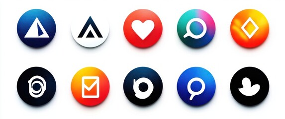 Set of ten round buttons each featuring a unique minimalist white icon on colorful gradient or solid backgrounds representing various abstract shapes and symbols