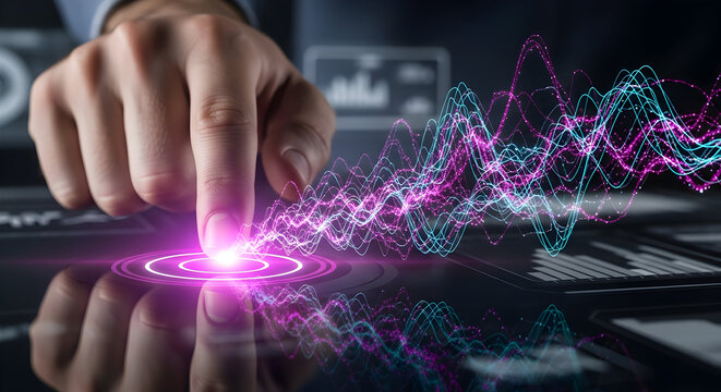 Close-up of a hand interacting with a glowing digital interface displaying complex data visualizations.