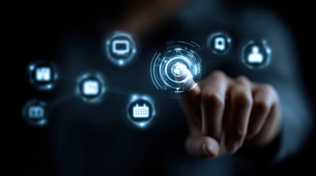 Futuristic digital interface with floating icons for technology, online connectivity, cloud computing, data security, and networking concepts