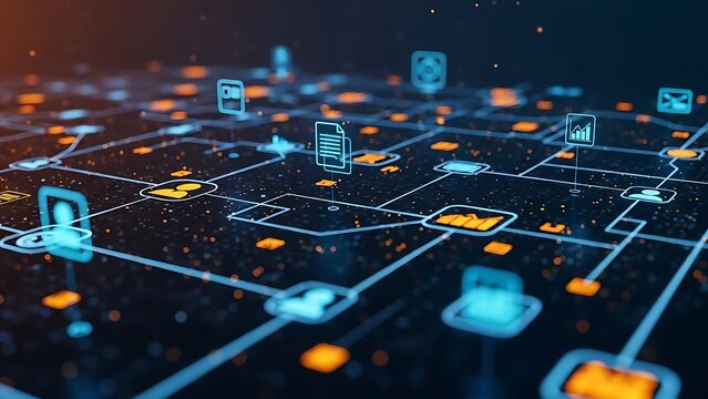 Futuristic network of glowing silhouettes connected by data flows in blue and orange colors
