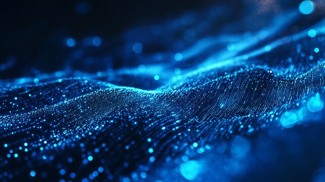 Stunning abstract wave of vibrant blue digital data particles flowing across a dark technological background