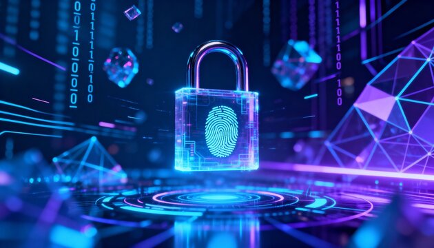 Digital padlock glowing in cyber space, fingerprint symbol in center, abstract secure data technology
