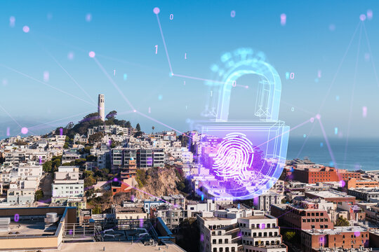 Digital security concept over cityscape with holographic lock and fingerprint.