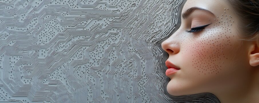 Woman face with dotted grid on white circuit board background. Female portrait with blue eyes and brown hair. Artificial intelligence concept with human face and digital pattern.