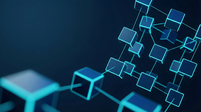 Abstract digital graphic of interconnected hexagons and cubes, light blue and transparent, with a security lock icon