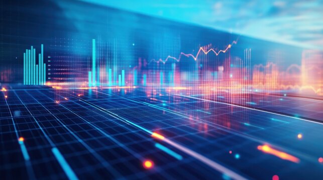 Stock market analysis with financial data visualization on trading graphs. Digital technology, investment strategy, and market trends with glowing indicators.