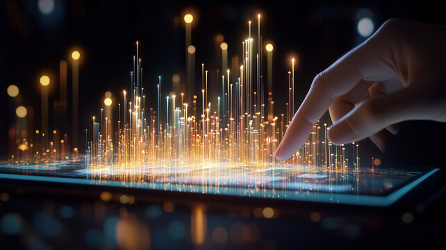 hand interacting with digital interface displaying glowing data visualizations, symbolizing technology and innovation. vibrant lights create dynamic atmosphere