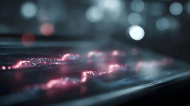 Abstract glowing digital data streams possibly representing genetic sequences on a textured surface with bokeh background
