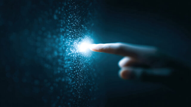 Technology cyberspace information datum digital touch interface finger glowing point light particle matrix future network connection data flow innovation glow minimal calm mood