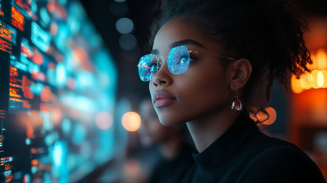Black woman viewing digital data interface with glasses reflection, exploring technology innovation and future computing concept