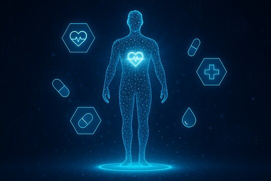 Dynamic abstract medical technology background with digital health data visualization and futuristic interface elements, representing innovation and progress in healthcare and scientific research
