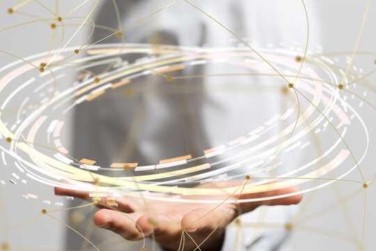 Businessman holding flying abstract sphere over mobile phone 3D rendering
