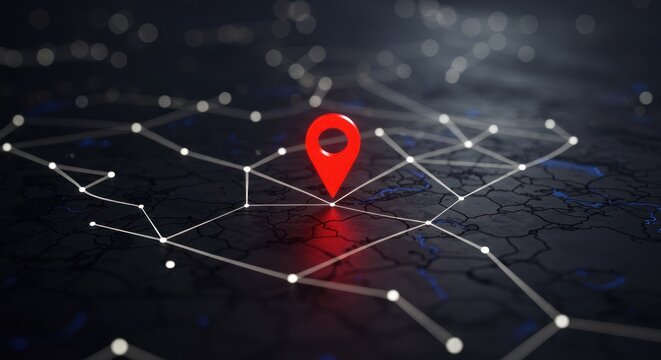 Glowing map pins highlight abstract routes, dark background