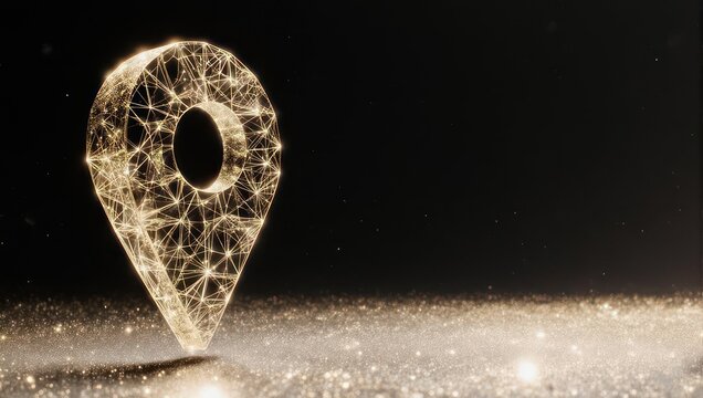 Stunning glowing golden pin marker symbolizing global connection and digital navigation on a dark, sparkling background