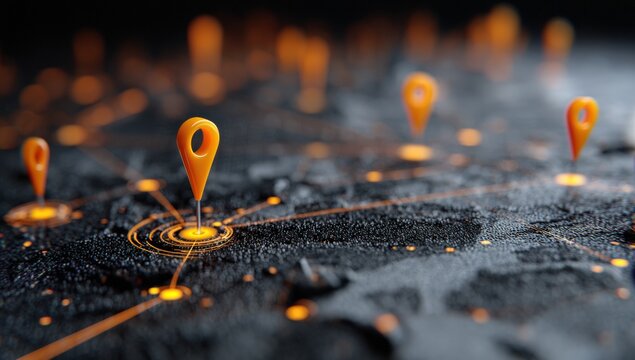 Glowing digital map with location pins and illuminated pathways on a dark background