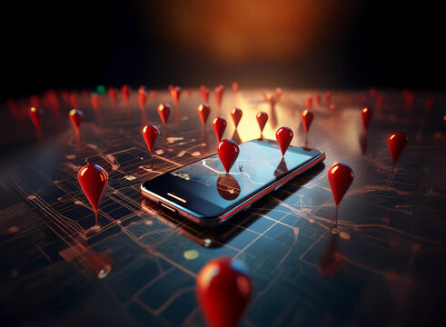 A smartphone lies on a digital map, surrounded by numerous red location markers, illustrating the concept of geolocation and mobile navigation.