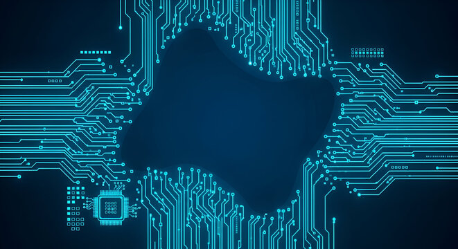 Abstract blue circuit board frame with central chip