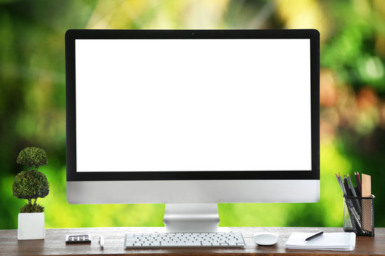 Computer on wooden table on nature green background
