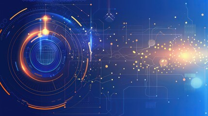 A glowing orb hovers above a digital landscape with concentric circles and scattered lights.