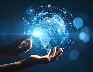 Global network of digital connections displayed in the hands.