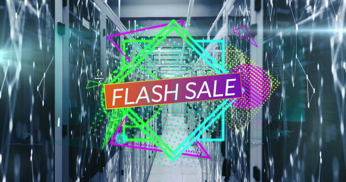 Image of flash sale text banner over abstract neon shapes against computer server room