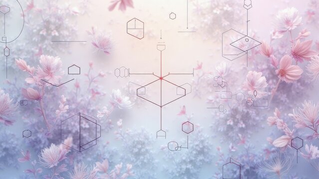 Futuristic floral background with geometric lines over soft pastel flowers