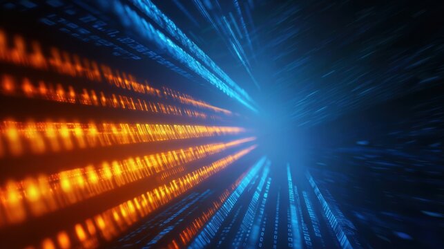 Abstract digital tunnel with glowing blue and orange binary code, futuristic tech and data transfer concept for cybersecurity and innovation