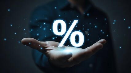 Glowing percentage symbol floats above open hand with blue digital particles percent sign light
