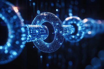 Digital chain network. Interlocking links with binary code. Abstract design. Futuristic tech concept. Blue background. Strong connection visualized. Data flow illustrated. Modern tech art. Secure