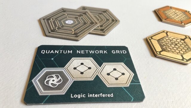 Abstract design of quantum network grid card on light background with hexagonal tokens, showcasing futuristic technology and strategy game elements