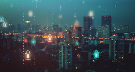 Digital security lock overlaying modern urban cityscape