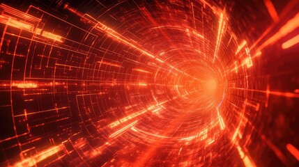 Digital tunnel features illuminated lines and circuit board patterns creating an abstract representation of big data processing, network connections, and modern technological advancements