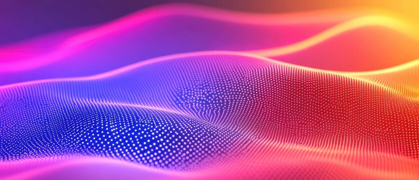 A vibrant wave of light particles in pink and blue, a mesmerizing abstract background for digital presentations. Purple background with many glowing particles. Information technology background.