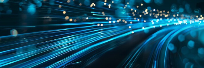 Abstract background with blue glowing light streaks and blurred digital data flowing through optical cable the air, representing the fast speed of internet technology