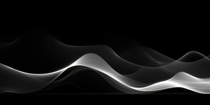 Abstract flowing wave of white digital dots and particles on a dark black background