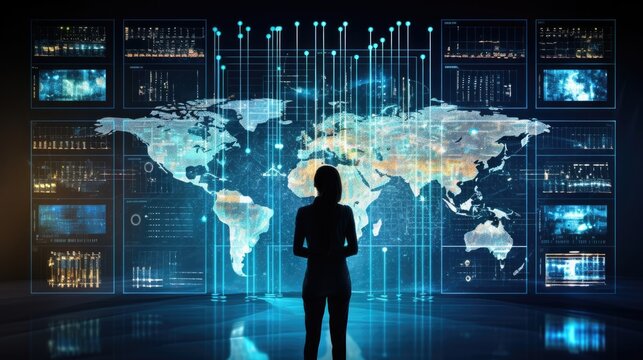 A woman stands in front of a large digital display showing a world map with glowing lines and data.