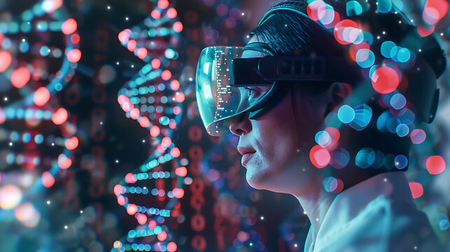 A scientist wearing advanced VR goggles, immersed in a virtual reality environment where they interact with 3D holographic DNA models, manipulating genes and sequences in real-time