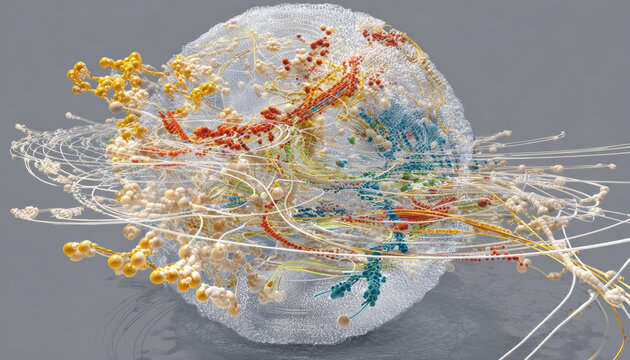 Abstract medical visualization showing complex biological cell with colorful protein structures and chaotic strands floating in gray background conveying sense of scientific discovery