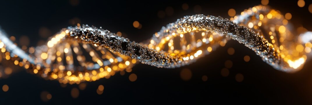 Shiny metallic DNA strand in abstract golden and silver light