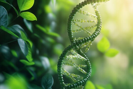 A vibrant green DNA strand intertwined with fresh leaves, symbolizing the connection between nature and genetics.