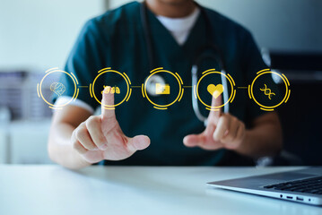 Businessman touching futuristic medical interface with icons