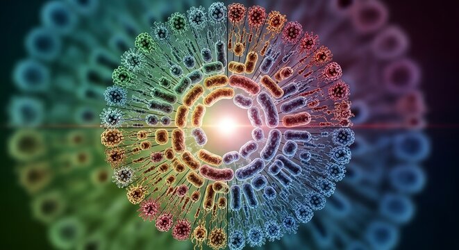 Abstract vibrant glowing cellular structures with interconnected organic shapes and a rainbow color spectrum against a dark background