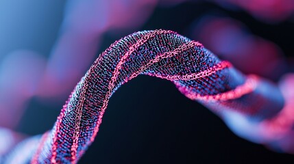 A colorful, abstract representation of a twisted strand, resembling DNA, with vibrant hues of blue and pink against a dark background.