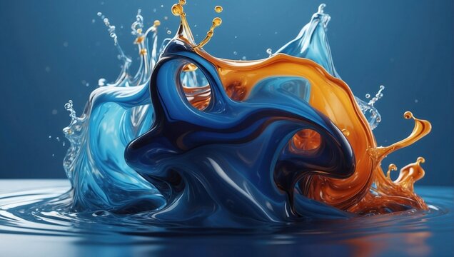 Dynamic abstract splash of liquid in vivid blue and rich orange, swirling together to create a captivating and high-energy composition with sharp, suspended droplets.