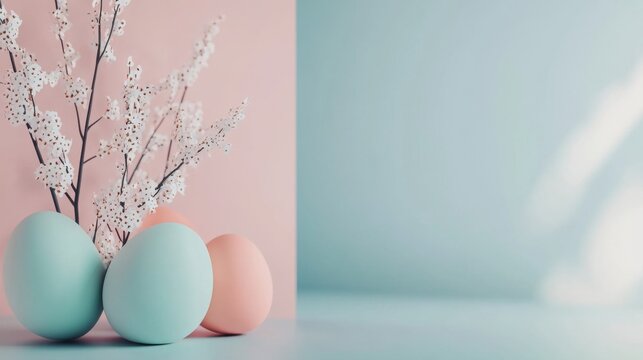 Minimal pastel Easter eggs with cherry blossoms on pink and blue gradient background