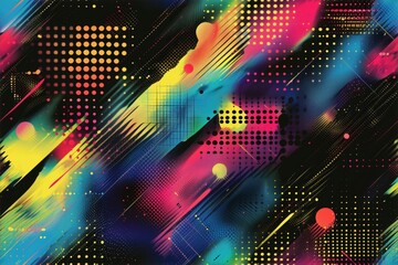 Seamless vibrant abstract halftone glitch background featuring a mix of colorful dots, lines, and shapes. The design includes bright hues of yellow, pink, blue, and green.