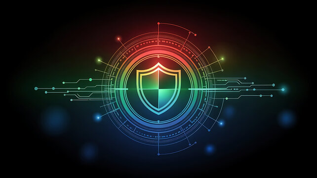 Abstract digital shield with glowing rainbow light effects and circuit board patterns on dark background