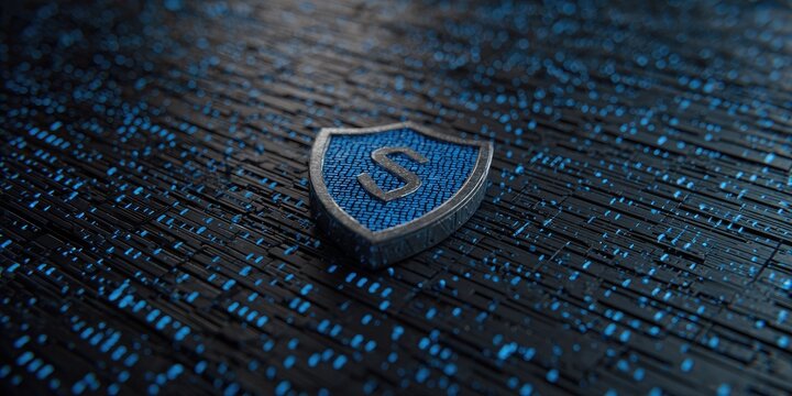 A digital concept shows a glowing shield with a lock symbol, surrounded by illuminated circuit patterns. The design emphasizes themes of technology and security.