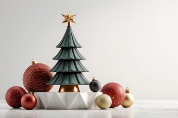 Stylized evergreen centerpiece rests upon a geometric white stand surrounded by assorted decorative spherical ornaments